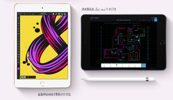 新款iPad Mini提升巨大本次更新的产品共有两款,分别是新款iPad Air和新iPad mini。其中iPad Air屏幕升级到了10.5英寸视网膜显示屏,iPad mini则保留了老款设计,依旧是7.9英寸屏幕,2048 x 1536的分辨率,326 ppi。性能方面二者均搭载苹果最新的A12处理器,对于mini用户体验而言,从A8到A12是一项巨幅升级。2019款iPad mini和iPad Air都有64GB容量和256GB容量版,售价分别从2999元和3999元起步,都提供可以插nano SIM卡的Cellular版本,且加入了对Apple Pencil的支持。