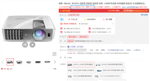 18日0点:BenQ 明基 W1070+ 投影仪 3899元包邮(需用券)